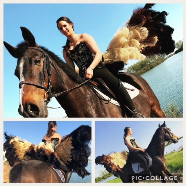 composée de 2 ailes en plumes d’autruche drabs , floss, blondine et oie teintées .