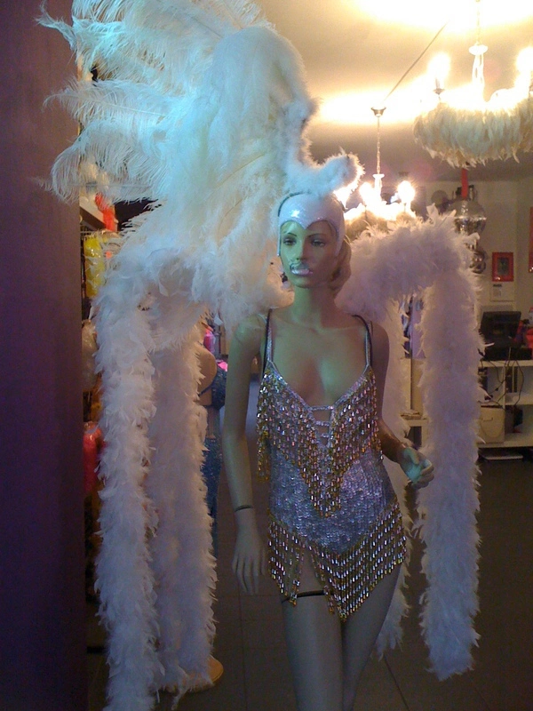 Ensemble dos de plumes cascade de boas de dinde déchirées+ casque demi lune en floss d’autruche, disponible dans divers coloris sur demande.