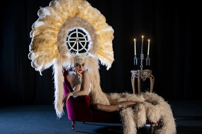 Est composé de plumes d’autruche drabs , perles , strass et boa autruche