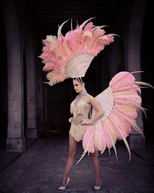 Casque féerie en plumes de faisans commun , faisans gouttières et autruche blondine