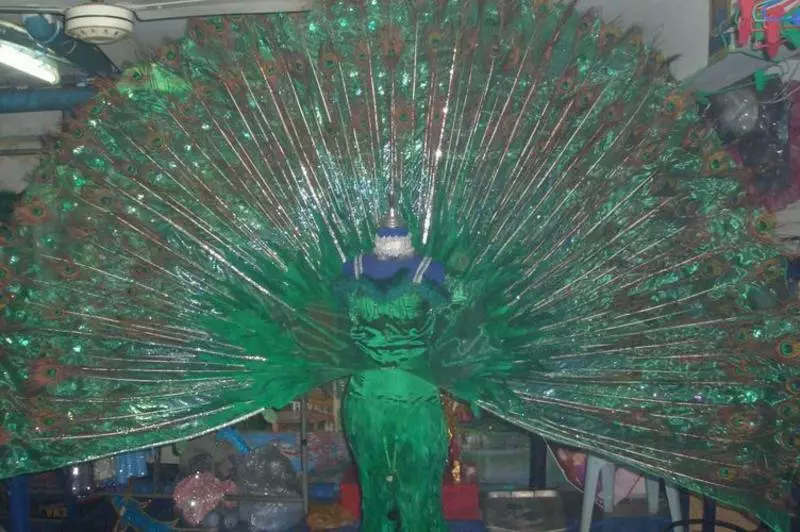 Robe longue avec traine en plumes de paon , systeme d’ouverture du dos en paon directement sur la robe au nibeau de la taille .