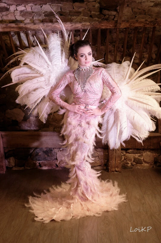 Vendu sans le collier en strass et sans l’armature en plumes blanches