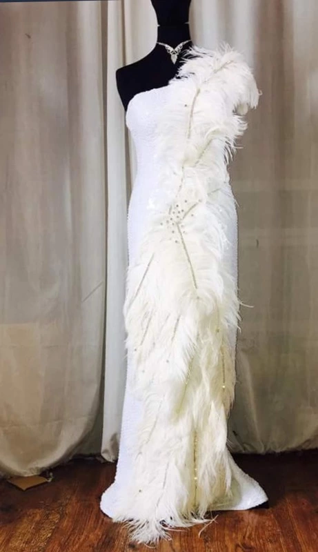 Cette robe est fendu à l’avant et à une petite traîne à l’arrière, elle est agrémentée de plumes d’autruches drabs et de strass .