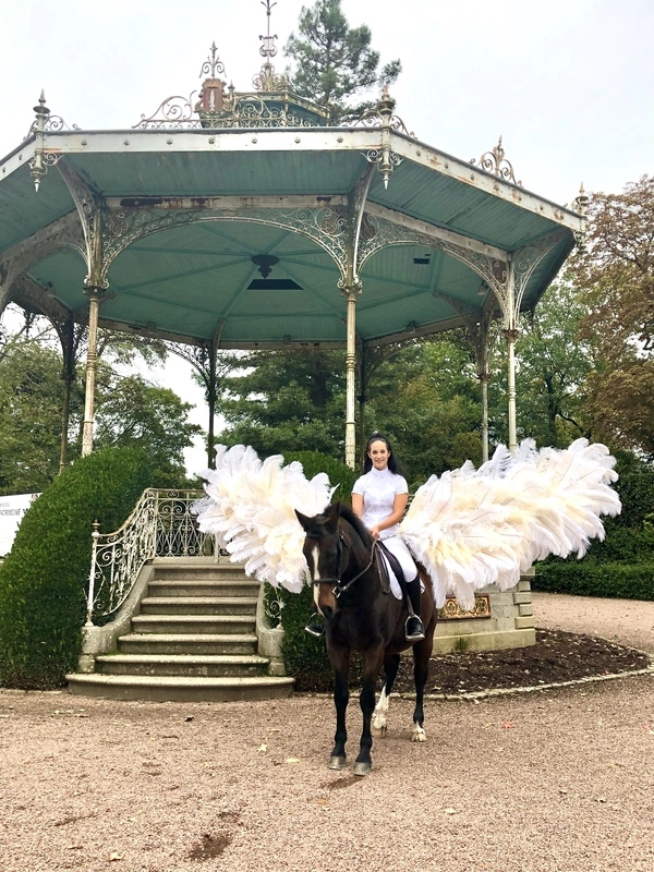 Ailes géantes en plumes d’autruche et blondine pour cheval